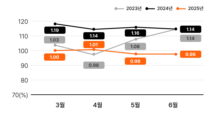 * 25년 3월 TOP100 업체 매출을 1로 기준 했을 때, 상대적인 매출을 표시한 그래프입니다. (ex. 25년 6월의 0.96 포인트는 6월 매출이 3월 매출보다 4% 하락한 것으로 해석)