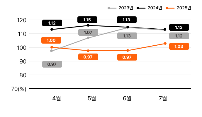 * 25년 4월 TOP100 업체 매출을 1로 기준 했을 때, 상대적인 매출을 표시한 그래프입니다. (ex. 25년 7월의 0.96 포인트는 7월 매출이 4월 매출보다 4% 하락한 것으로 해석)