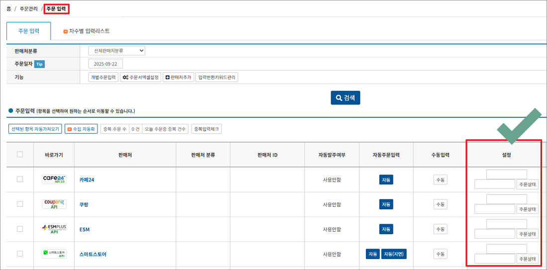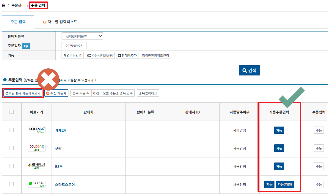 [주문 수집 판매처별 자동 버튼 사용 방법]