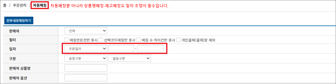 연휴 후 첫 작업은 ‘판매처 일괄 수집’ 대신 ‘각 판매처별 자동 버튼’으로 주문 수집을 권장 드립니다.